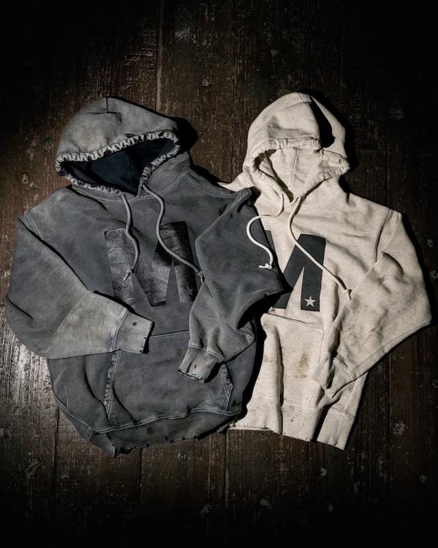 Mの定番ロゴをベースに、加工は岡山児島の職人により仕上げた、hand work used wash sweat foodie(M)。 身幅 L 57 XL 63 着丈 L 62 XL 67 肩幅 L 51 XL 56 cotton 100%