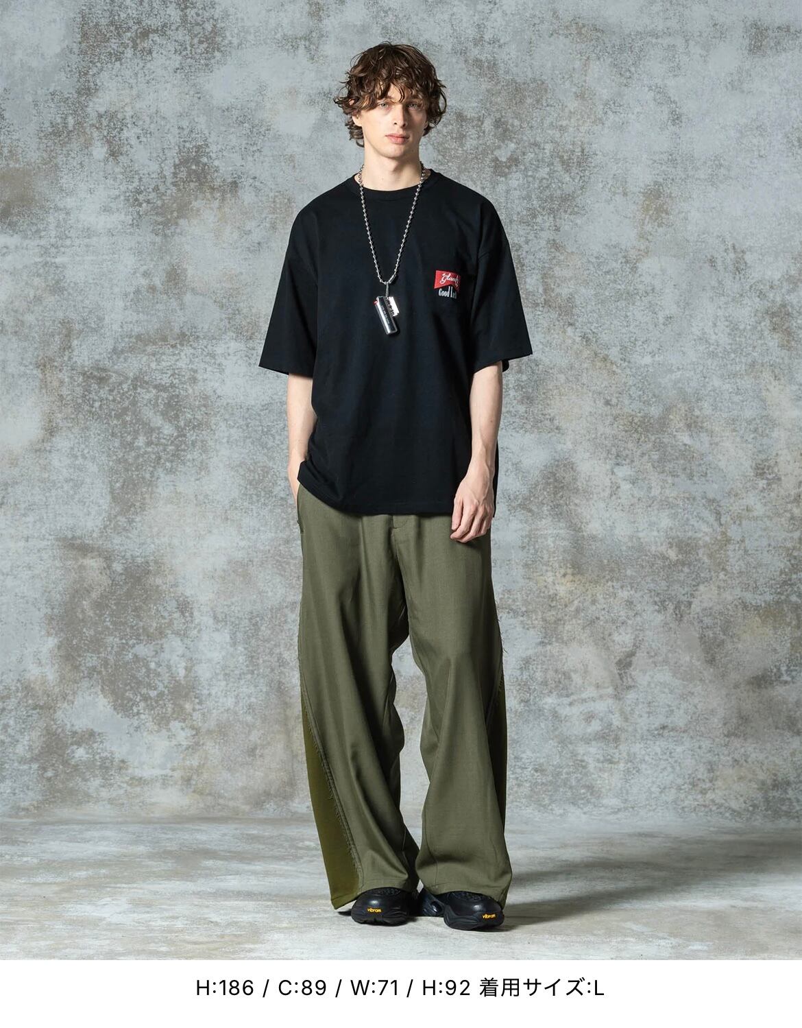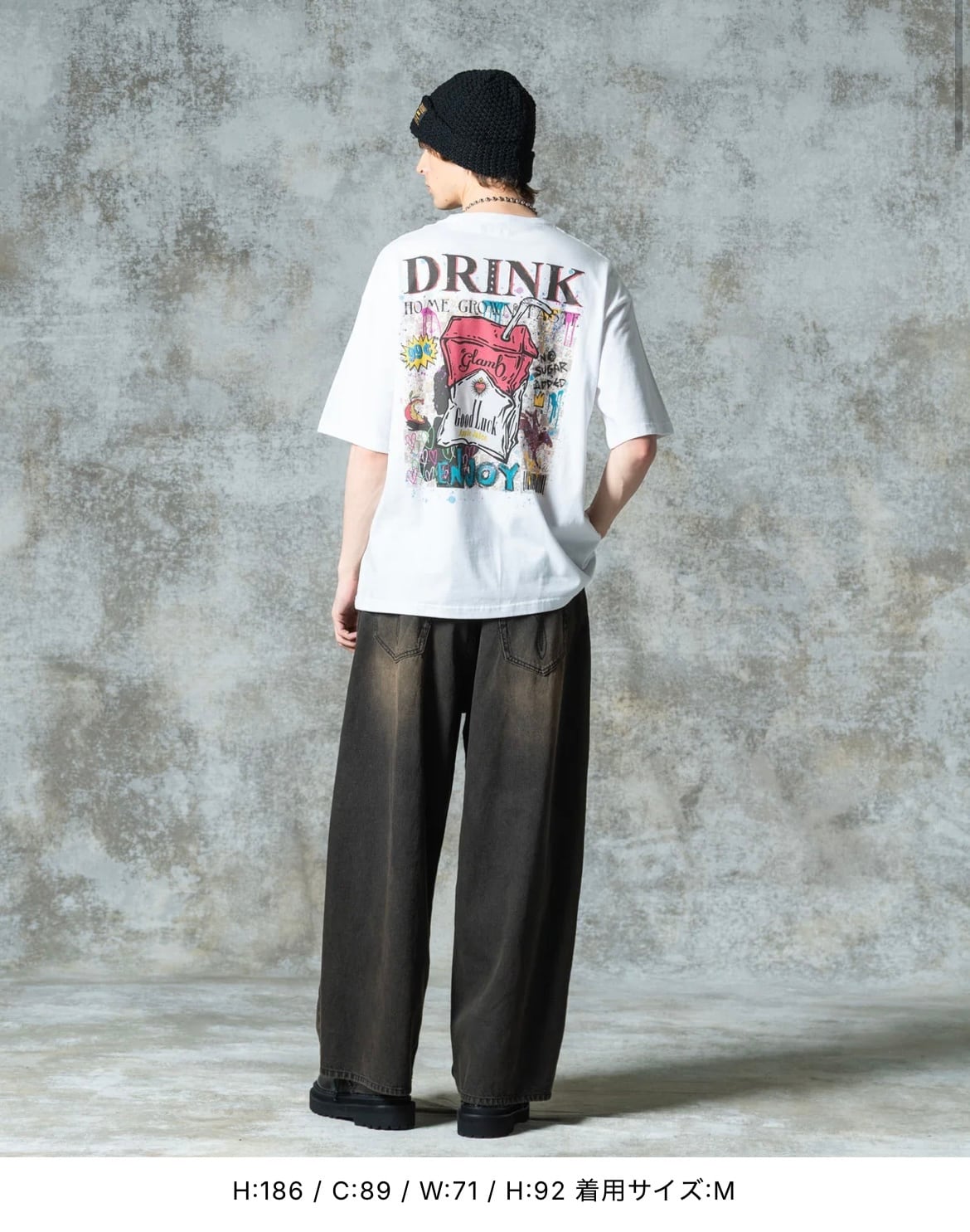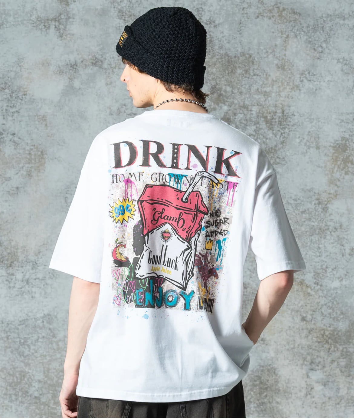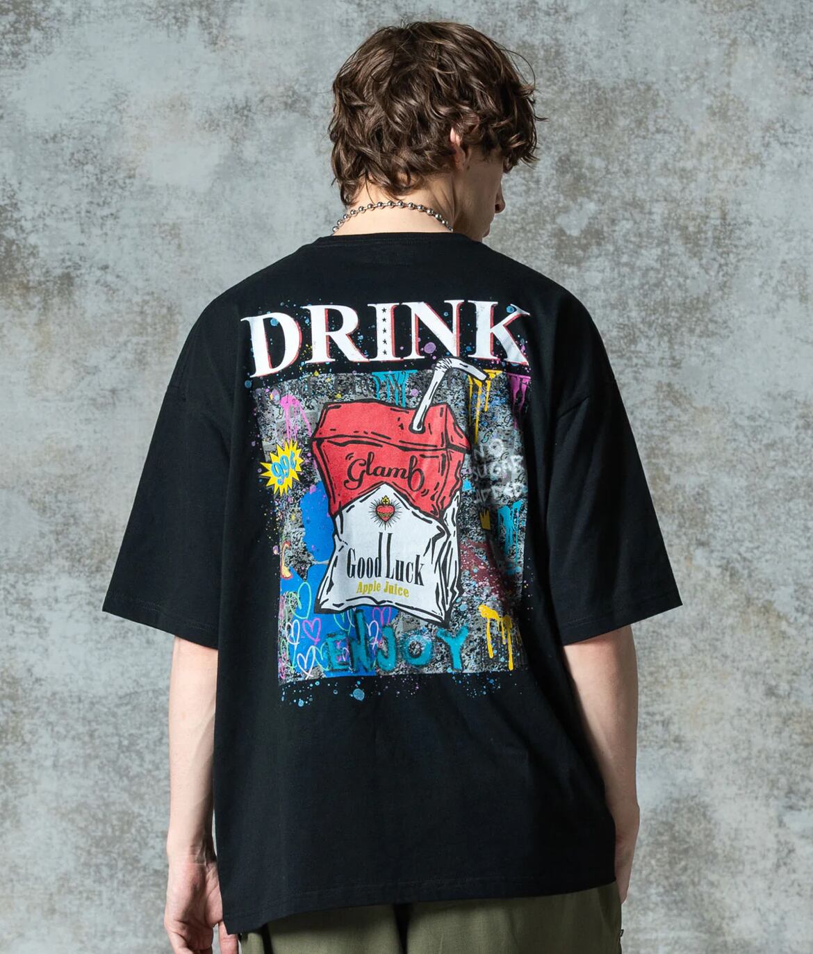 ウィットあるバックプリントでリリースの度にヒットとなるGood Luck T-shirtの最新作は、ミューラルアートを思わせるストリートなデザイン。雑誌の表紙をイメージしたバックスタイルのレイアウトにおいて主役となるのは握りしめられたアップルジュース。そこにタギングやペイント、今季のテーマにちなんだシルエットを組み合わせて賑やかなポップアートを描き上げました。テキスタイルに使用したのはコットン100%の5.6オンスミディアムウェイト天竺。着丈と身幅にゆとりを持たせたビッグシルエットはドレープ感ある仕上がりで、軽やかな着こなしを演出します。