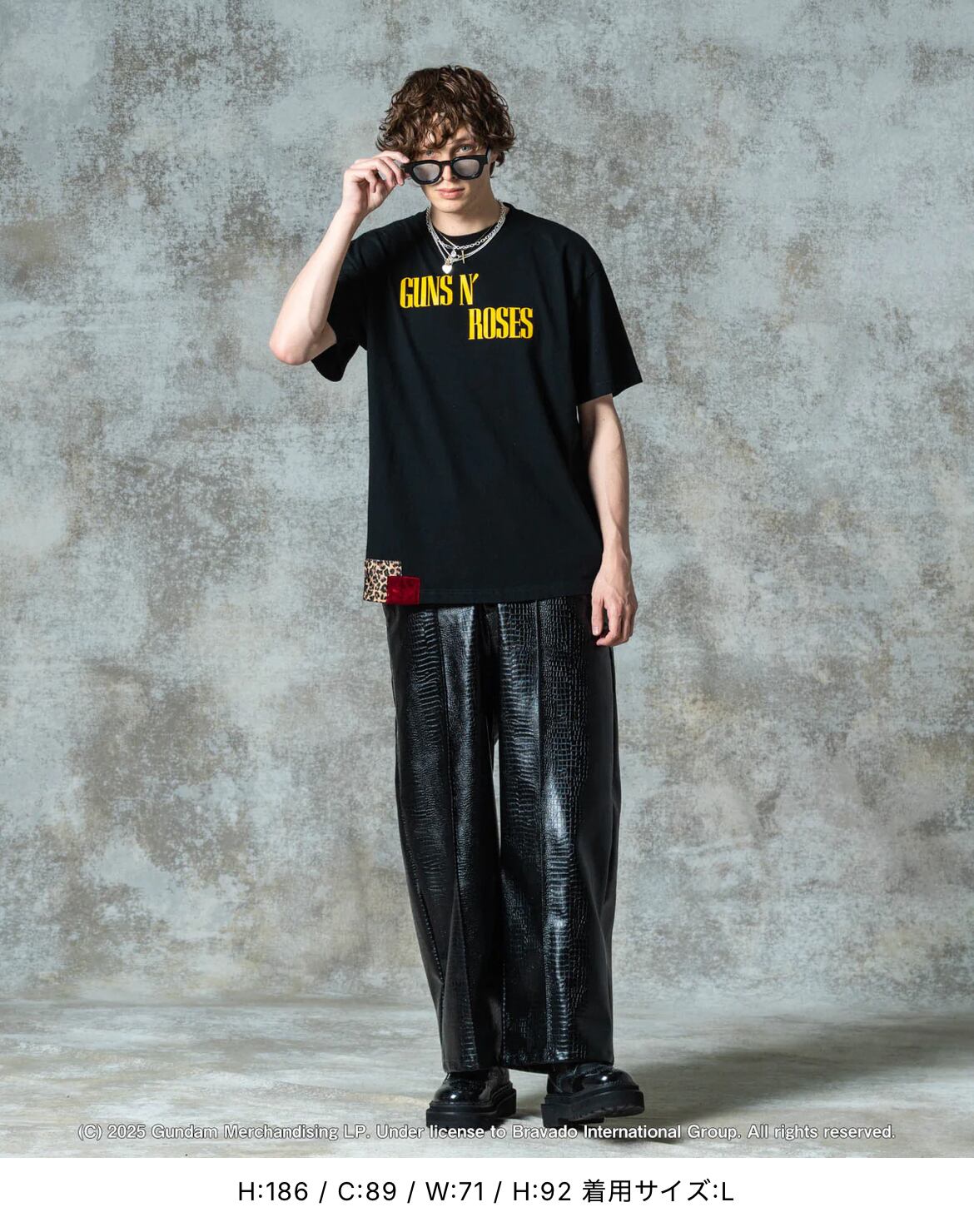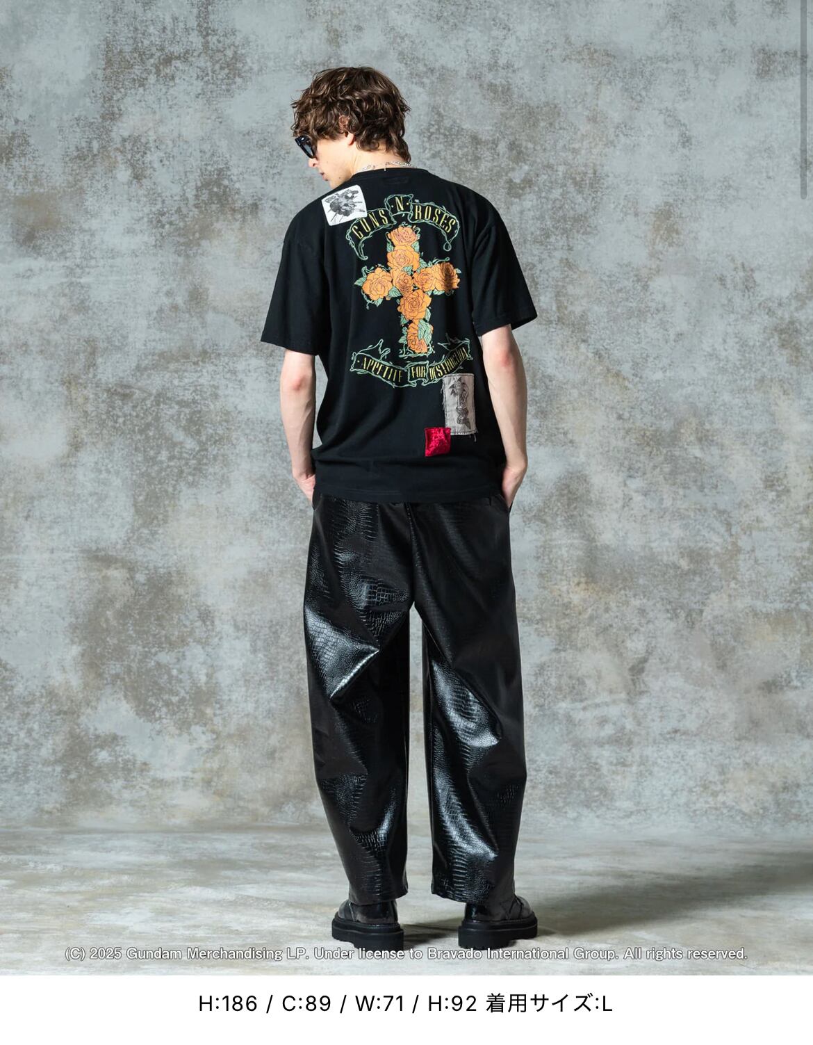 ガンズ・アンド・ローゼズが1987年に発表した名盤のアートワークにglambの解釈を加えて洋服へと落とし込んだGUNS N’ ROSES Cross T-Shirt。主張を放つのはアルバム『アペタイト・フォー・ディストラクション』に見られるクロスモチーフを薔薇柄で再構築したバックプリント。さらにバンドのモチーフをプリントしたスレキやベロアをボディの随所へランダムに当てて、ロックのテイストの中にクラフトマンシップが息づくglambらしい佇まいにまとめ上げました。コットン100%の5.6オンスミディアムウェイト天竺を用いたボディはレギュラーフィット。動きやすい仕立てはストリートからフェスまで頼れるパートナーとして活躍します。
