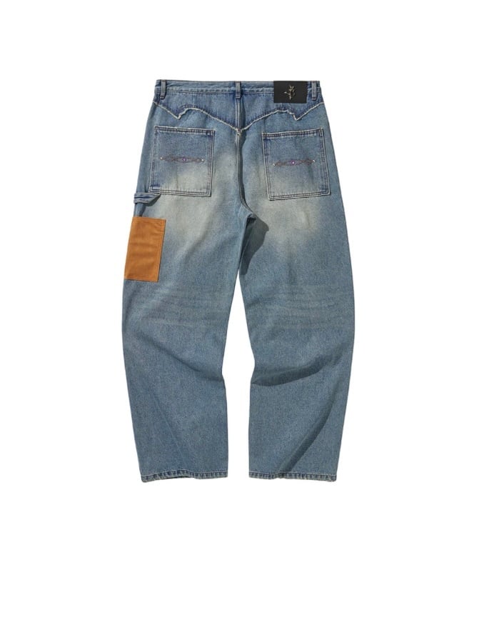 ・ウエスタントライバルを刺繍したダブルニーデニムパンツ