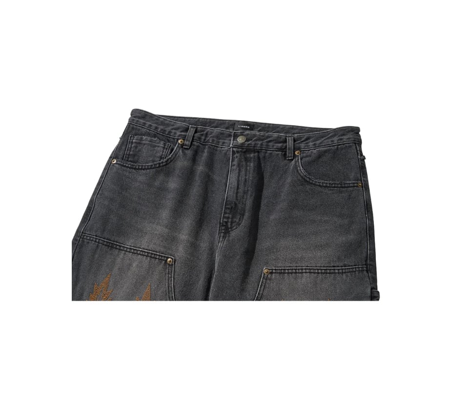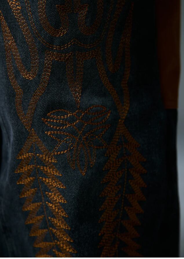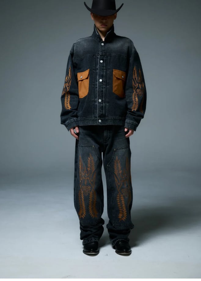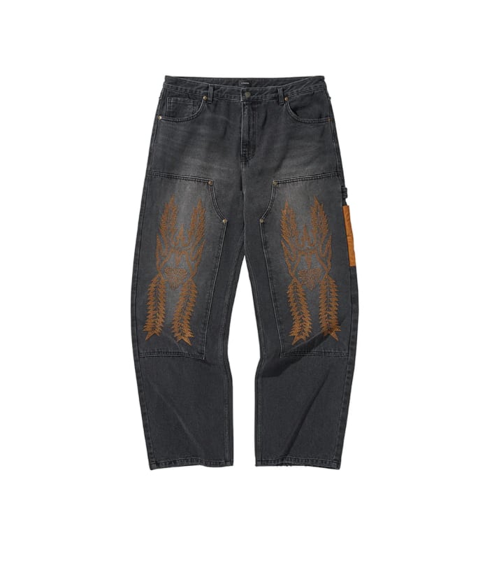 ・ウエスタントライバルを刺繍したダブルニーデニムパンツ