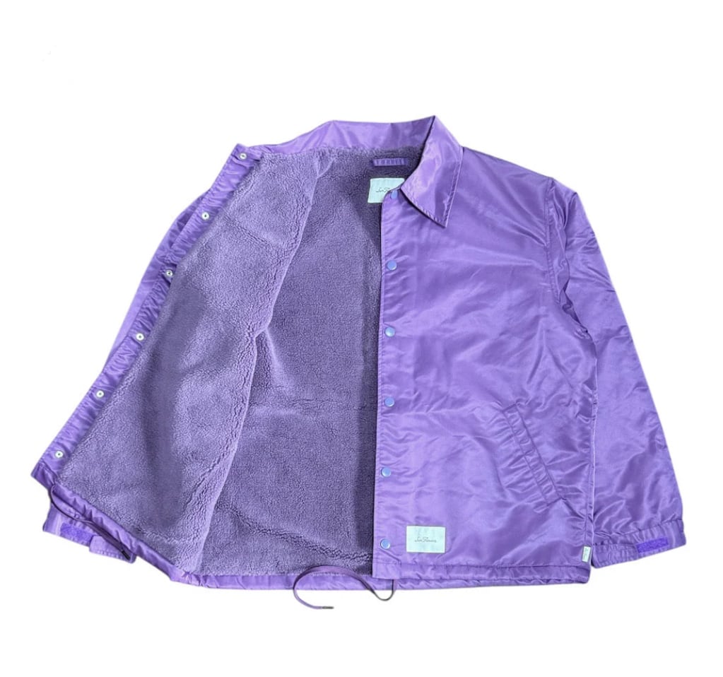表地と裏地のトーンを合わせ、奥行きのあるパープルワントーンに仕上げた、あえて1サイズ展開にすることで、古着のように出会いでサイズを選ぶ感覚を再現。