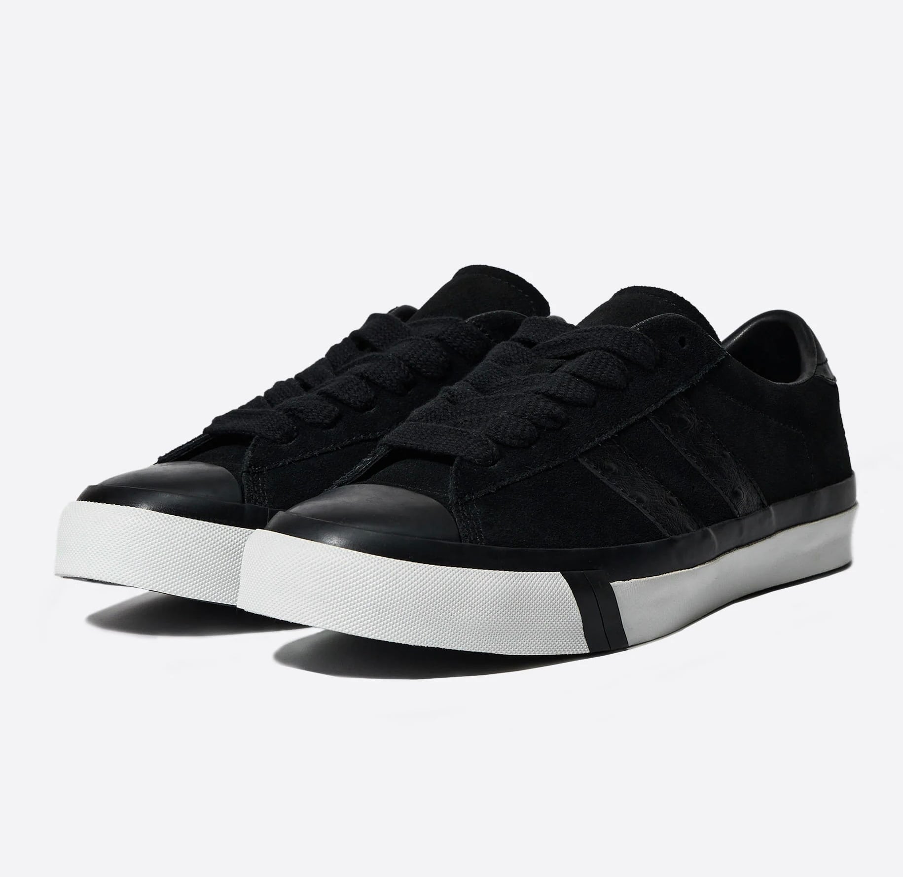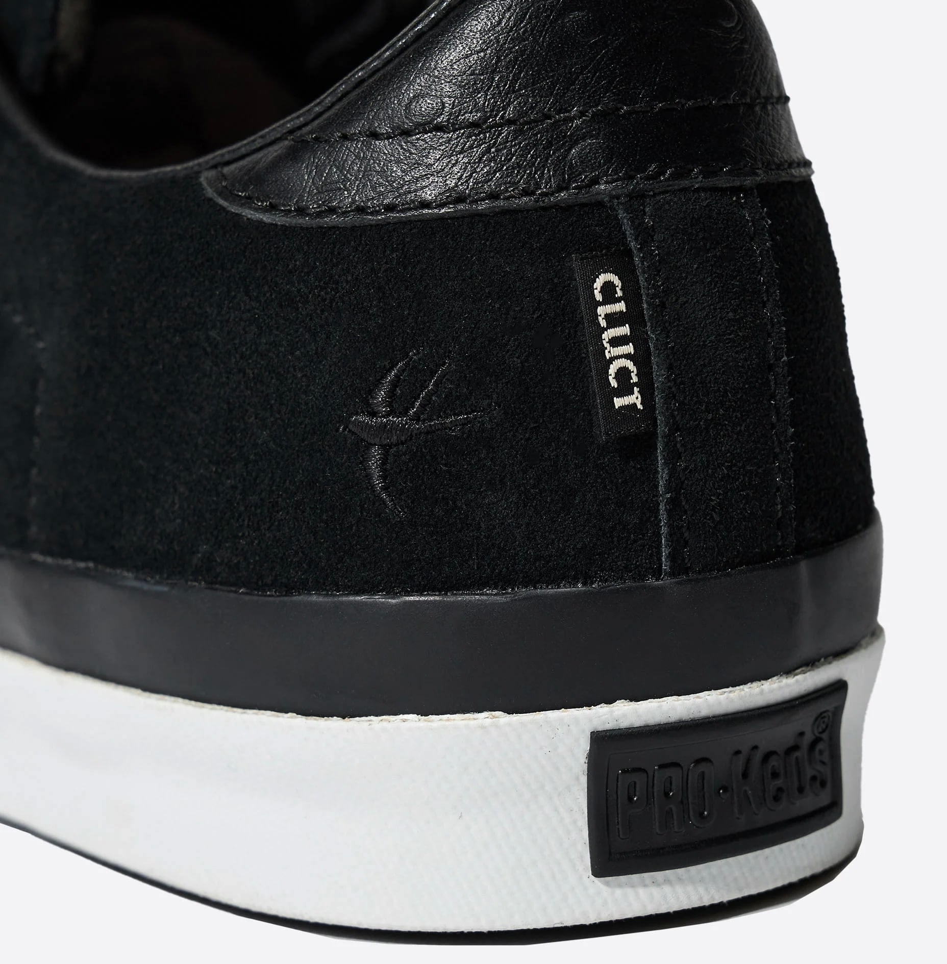 アイコンの1つであるROYAL PLUS(ロイヤルプラス)は1972年に発表され、アッパー側面の2本ラインとソール側面に配したレッド&ブルーのパワーストラップの装飾が特徴となったモデル。そして、現代的なアプローチでアーカイブの魅力を新たに提案する日本発信プロジェクト「Neo PRO-Keds」によって再構築されたこの復刻ばーじは、路面状況を選ばす高いグリップ力を発揮する「Vibram®︎MEGAGRIP」のオリジナルソールを搭載して機能面をアップグレード。ヴィンテージのディテールを追求しながら進化を遂げたオールドスクールスタイルの新定番をベースとした本作は、「ベーシック+αの落とし込み」をコンセプトに掲げる2008年設立の東京発ブランド〈CLUCT(クラクト)〉と『mita sneakers』がチームアップした三者によるコラボレーションモデル。毛足の短い上質なスウェードをベースに高級感を演出するオーストリッチ調の型押しレザーをあしらい、ヒールにはシンボリックなツバメの刺繍と同ブランドのピスネームをプラス。加えて、シルエットを引き立てるホワイトのサイドウォール以外のパーツをオールブラックでまとめ、無骨印象の無彩色で構成しながらも、立体的なコントラストで魅せる逸足に昇華。