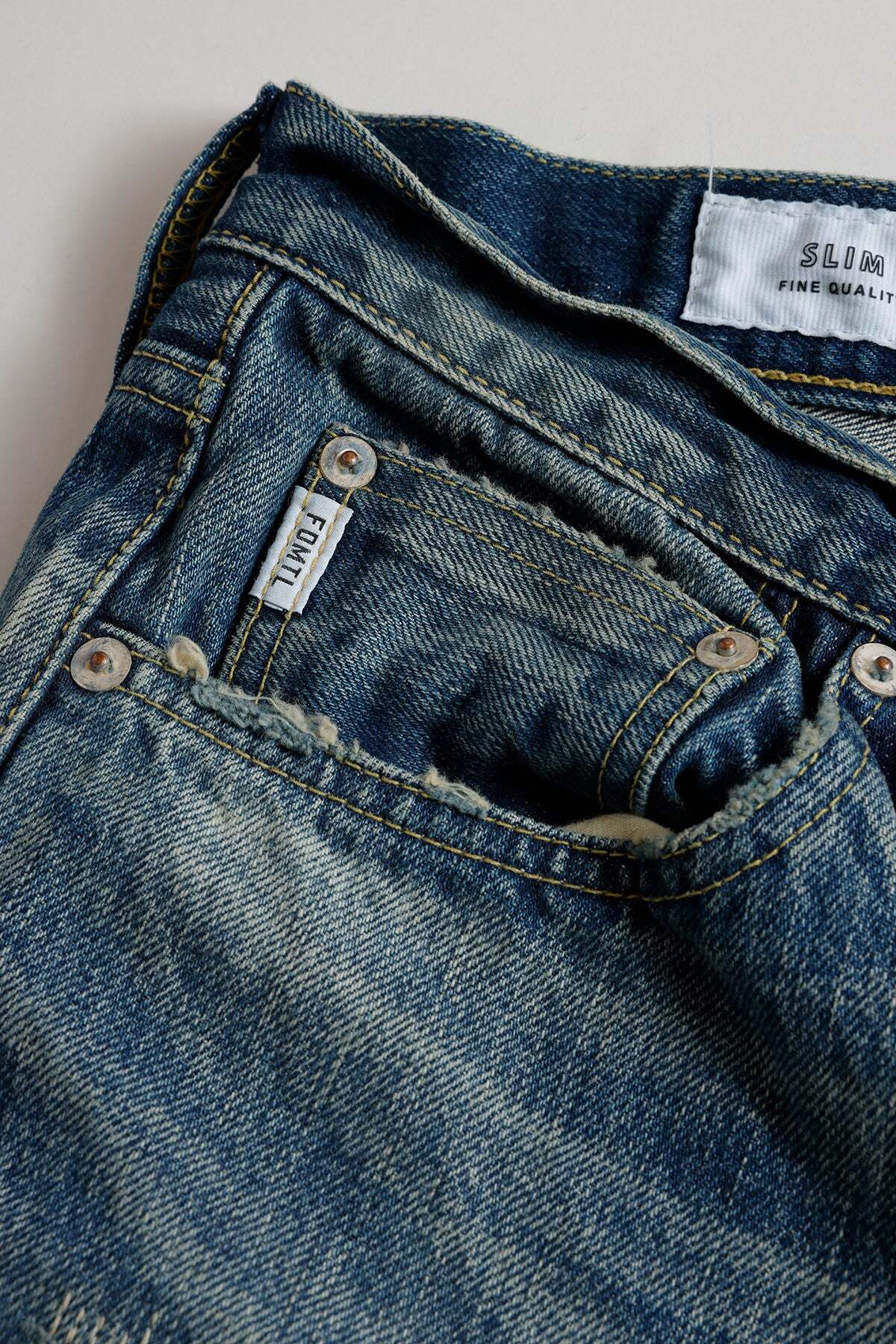 FDMTLのデニムの特徴である左ポケット口のキーホルダーループ、ベルトループ下には取り外し可能なチャームベルがつきます。