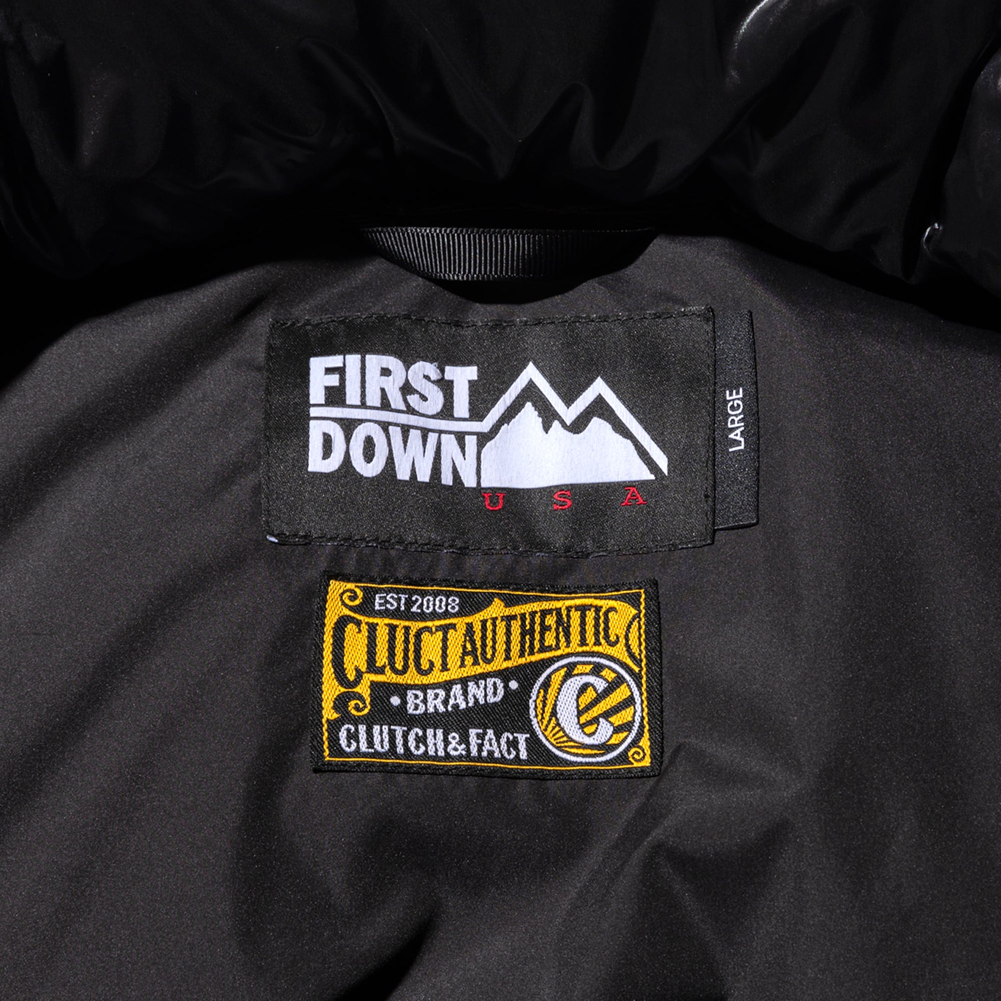 胸元、腕部分にはFIRST DOWNの刺繍ロゴを配置し、背面に大判のネームタグを施しました。 ポケット部分にはCLUCTオリジナル引き手を採用。 また裏地部分のメッシュポケット