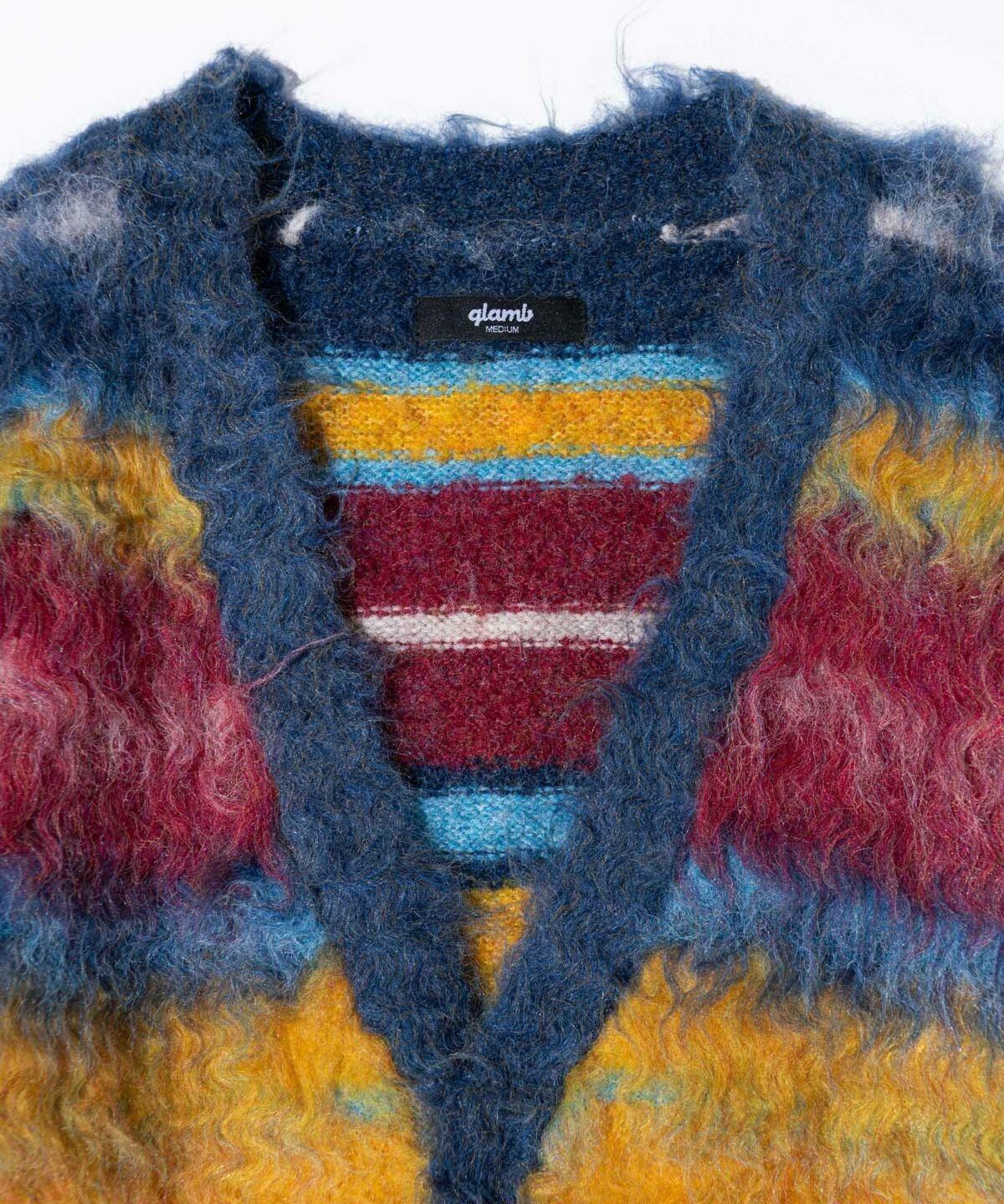 前季で好評を博したGlamour Cardiganが一層パンクテイスト感じさせる面持ちとなって今季登場。ランダムピッチであしらわれたマルチボーダーは配色にもブランドのロックマインドが反映されています。ファジーな毛羽立ちのテクスチャは素材にループヤーンを用いてボディを編み立て、仕上げに薬剤に浸してブラシ加工を施すことで叶えたもの。素材のテクスチャを際立たせるよう前身頃の合わせは裏面に隠したスナップボタン仕様となっています。