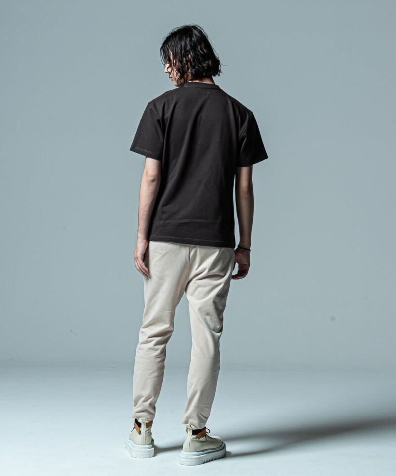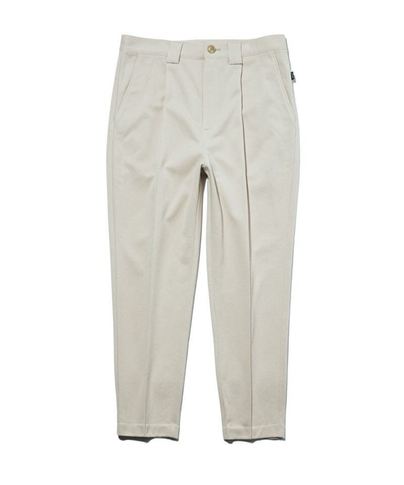 ドレッシーでありながらイージー、大人のスタイリングに絶好の1本となるEasy Slacks。シルエットはスラックスのパターンを使用した上品なテーパード仕立てながら、スウェット生地を落とし込むことでリラックスした着用感にまとめました。スウェット素材は織り皺が伸びてしまうためセンタープリーツを設けることができないところ、本作では同じ位置にピンタックをあしらうことでプリーツに代用。アイロンなどの手入れ不要で着用できるのもドレスとイージーをミックスするこちらの1本に相応しい仕様となっています。